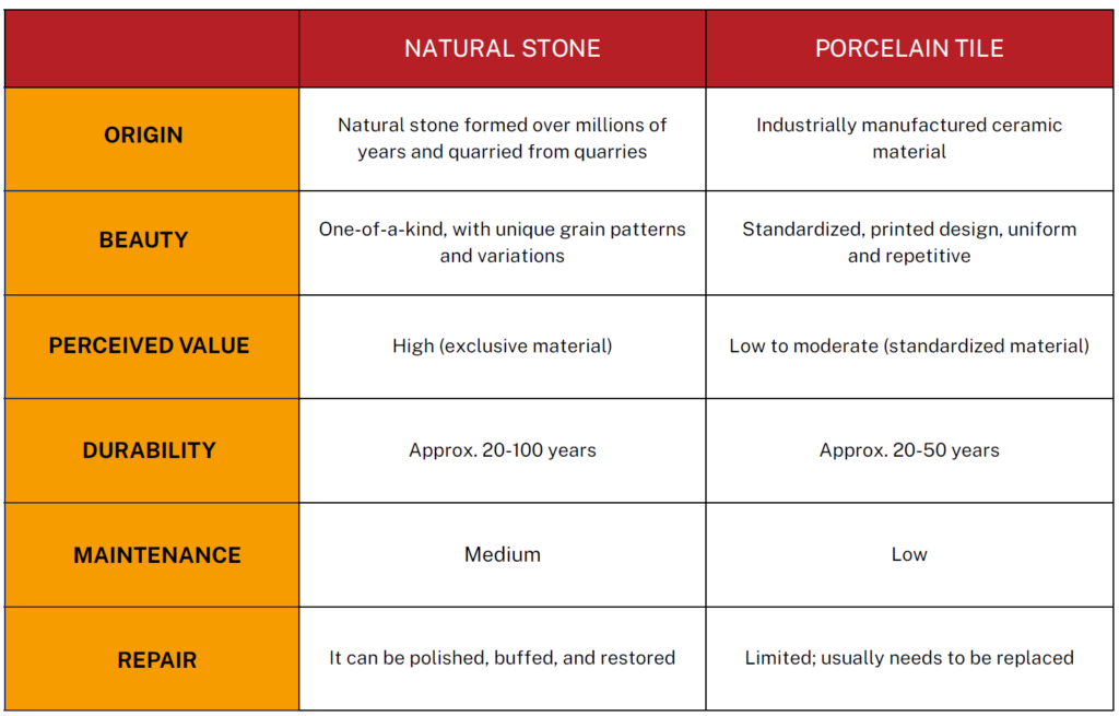 When comparing natural stone with marble-effect porcelain tiles, it is important to consider a number of factors that go beyond the design.