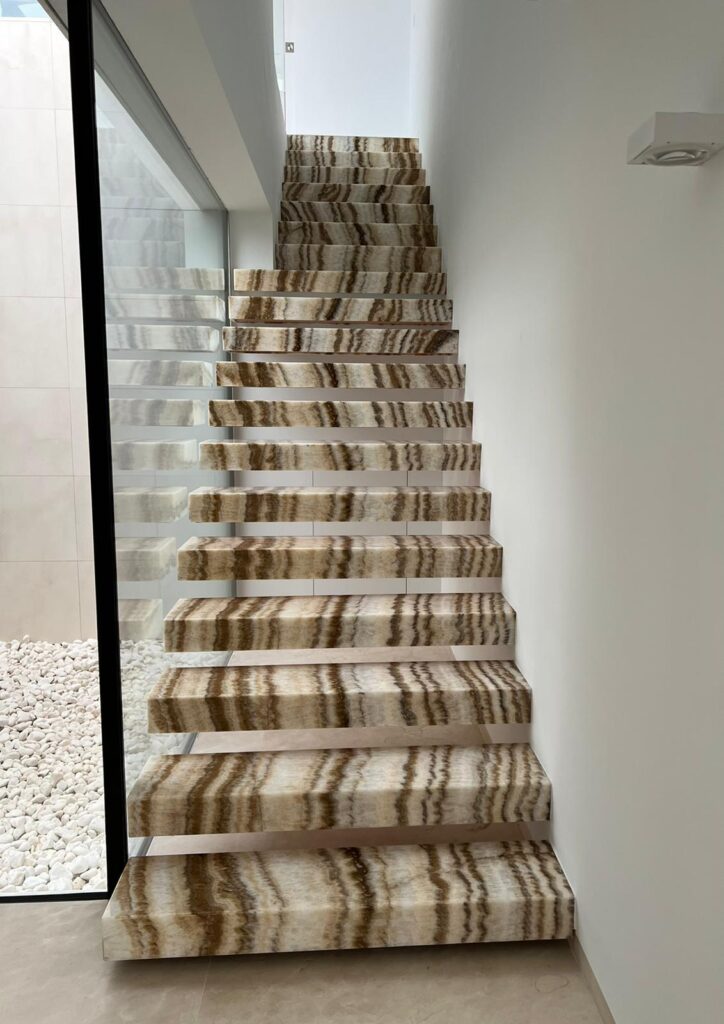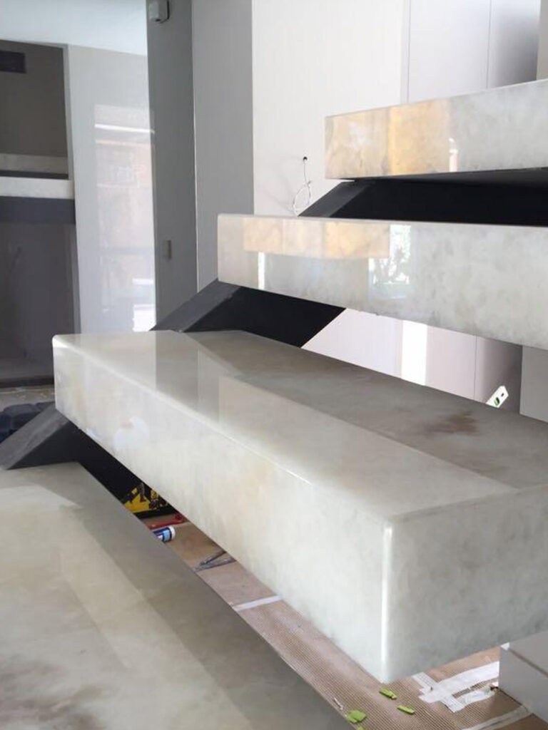 Escaleras de onyx sin iluminación vs iluminada by Eleria Design