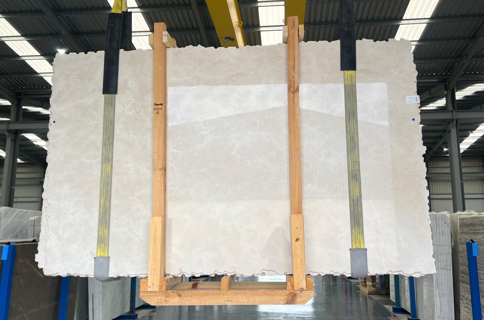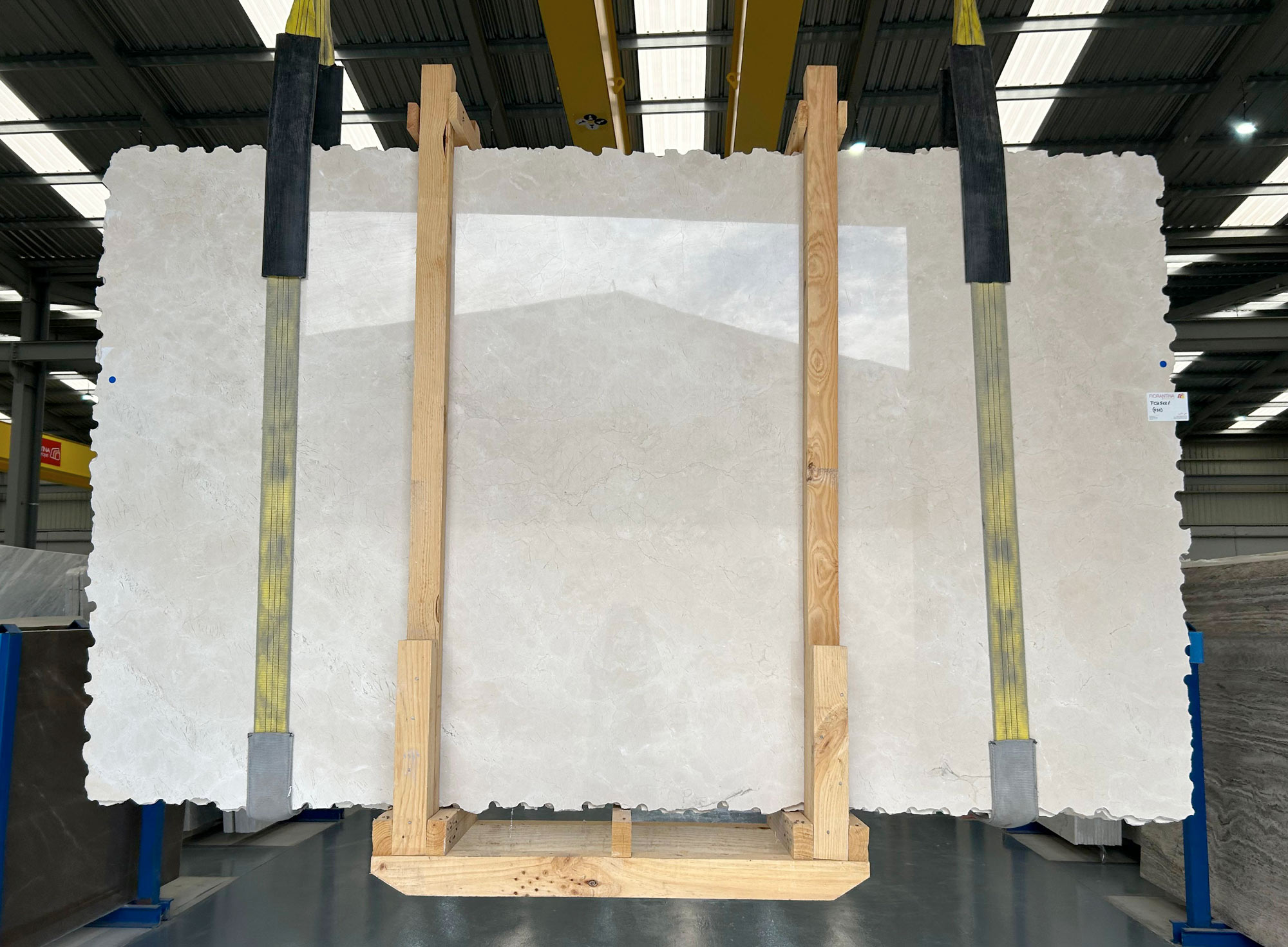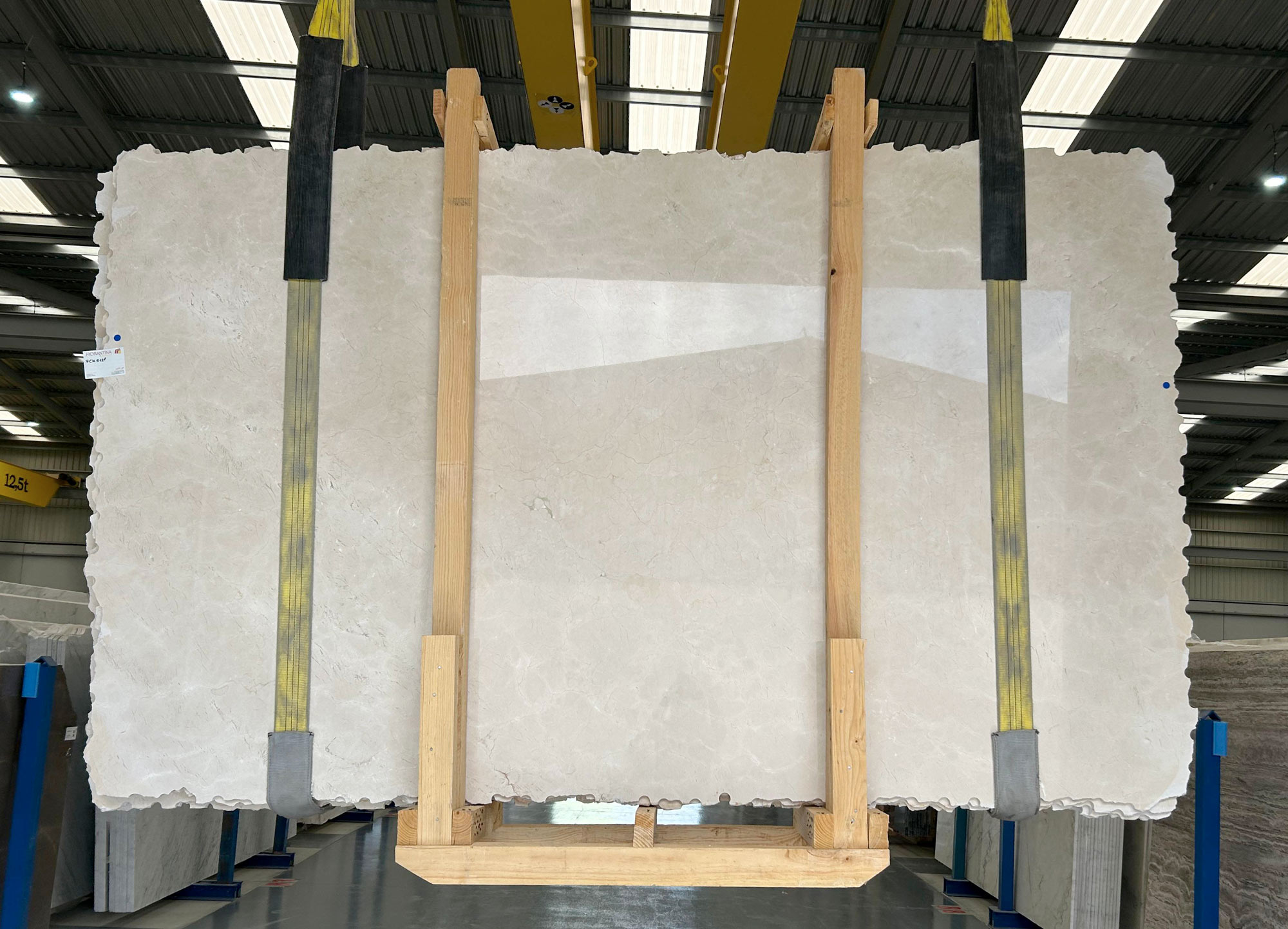 Mármol Crema Marfil en tablas pulidas de 2 cm de grosor.