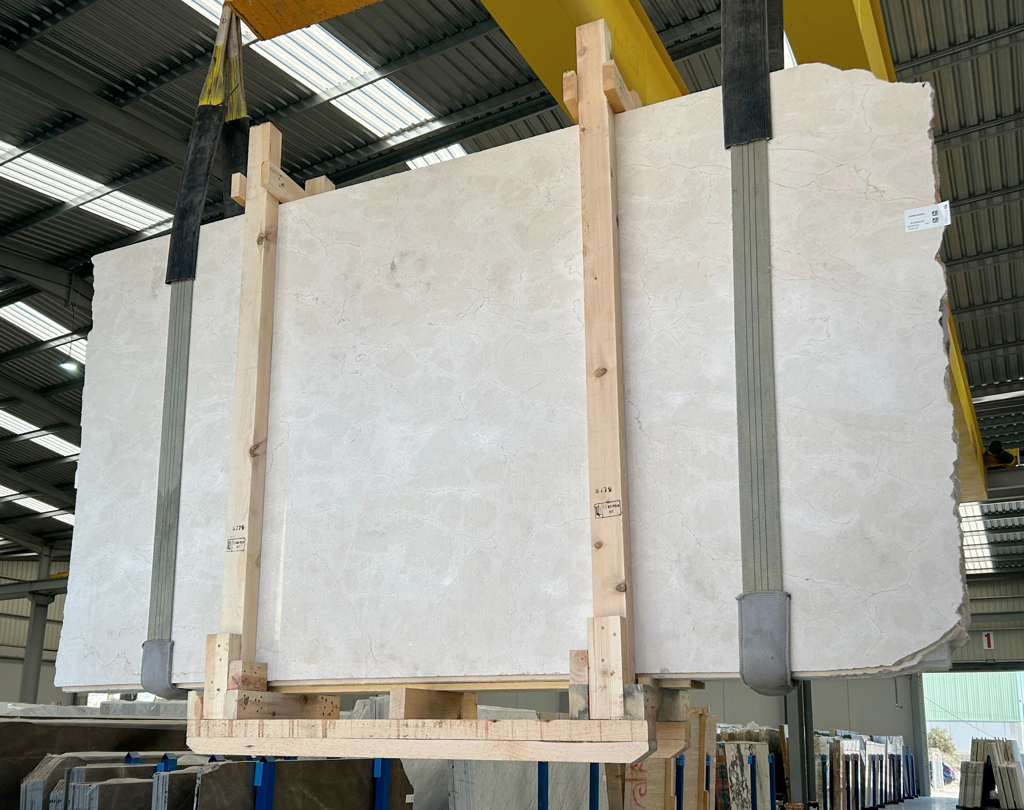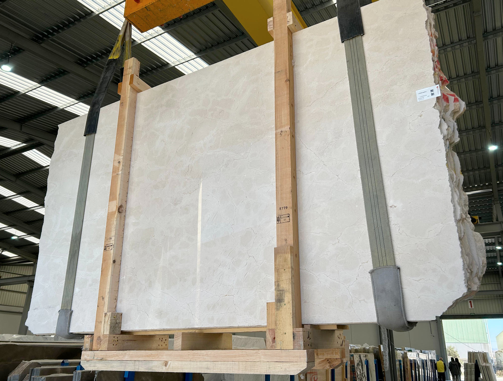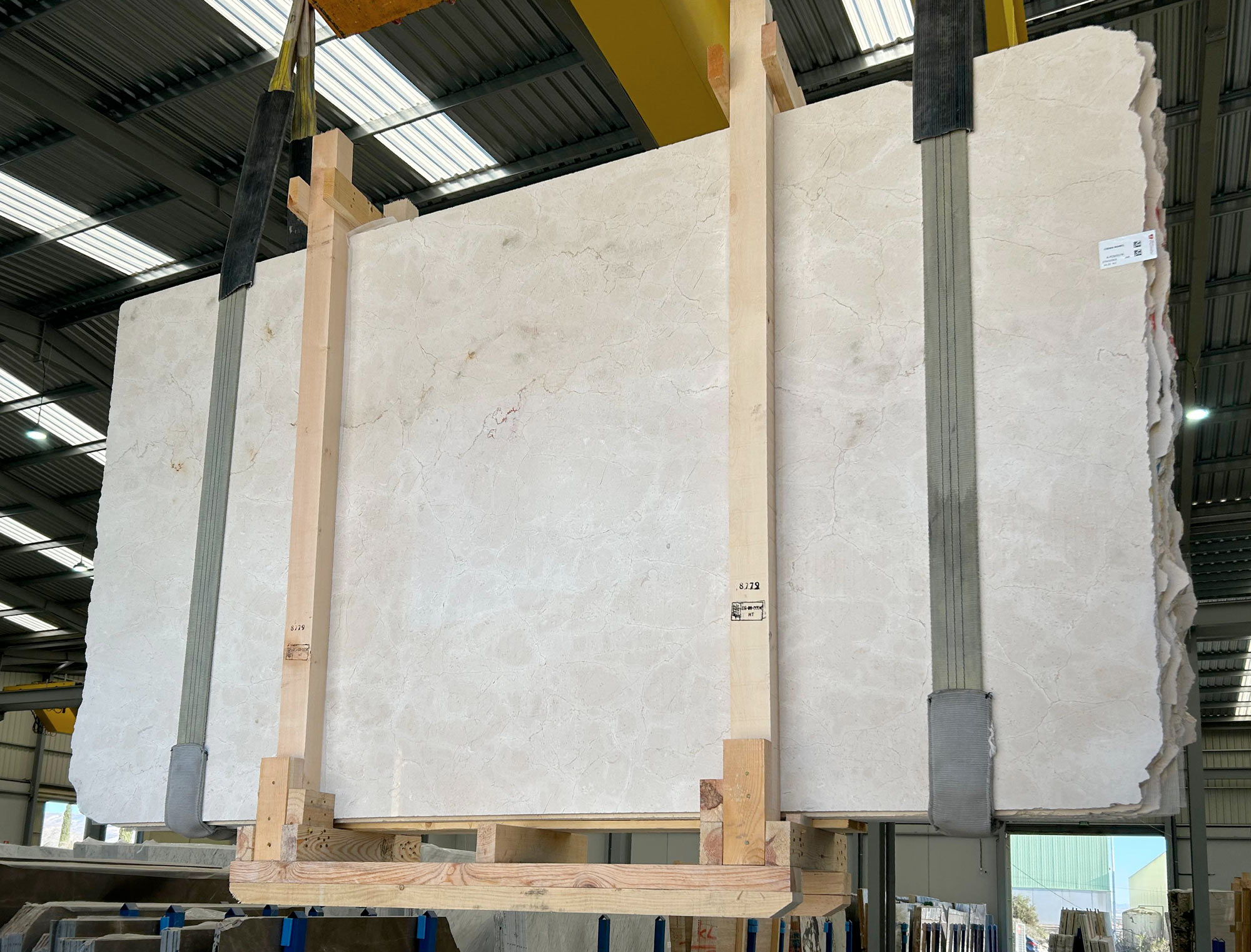 Mármol Crema Marfil en tablas pulidas de 3 cm de grosor.