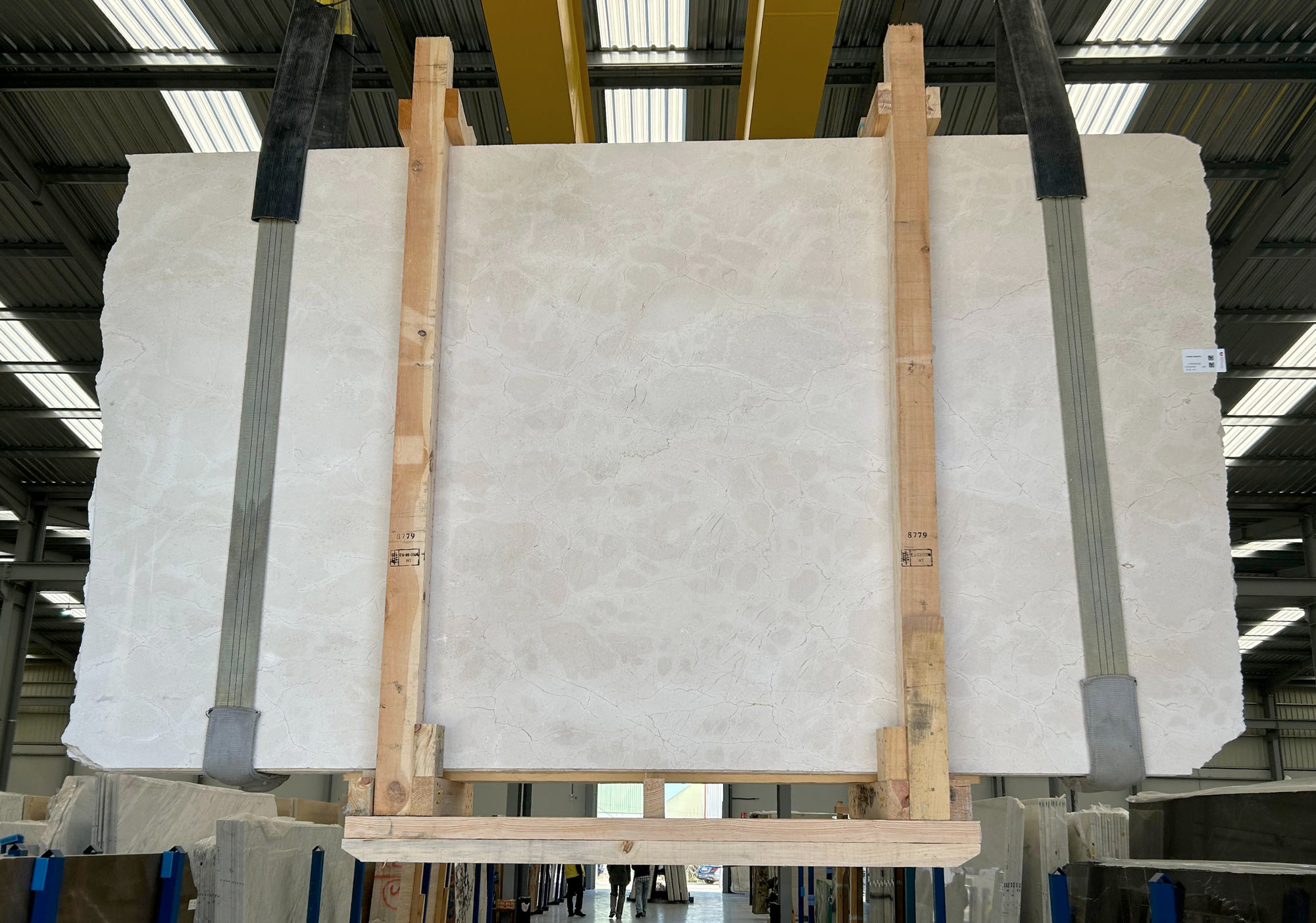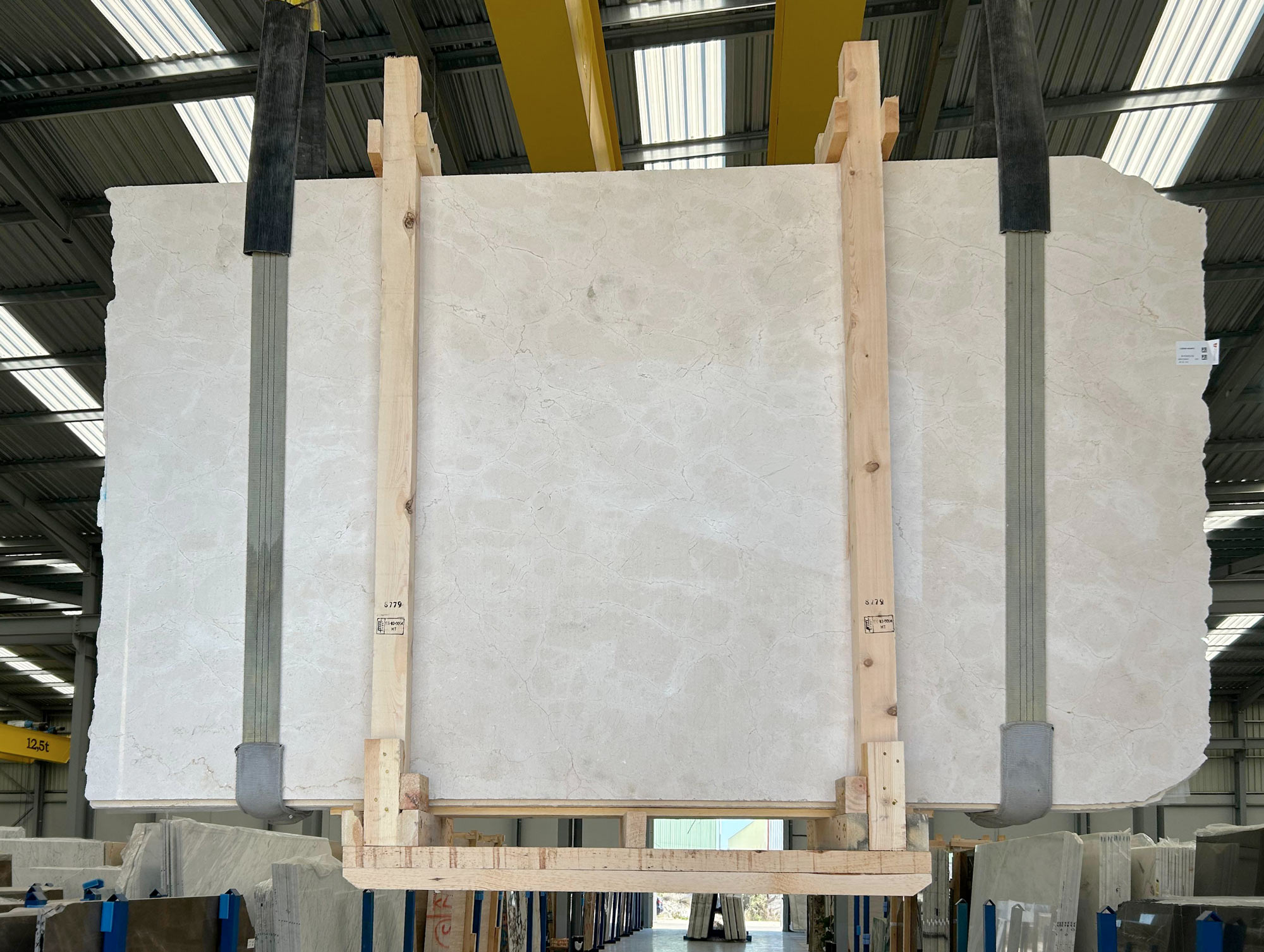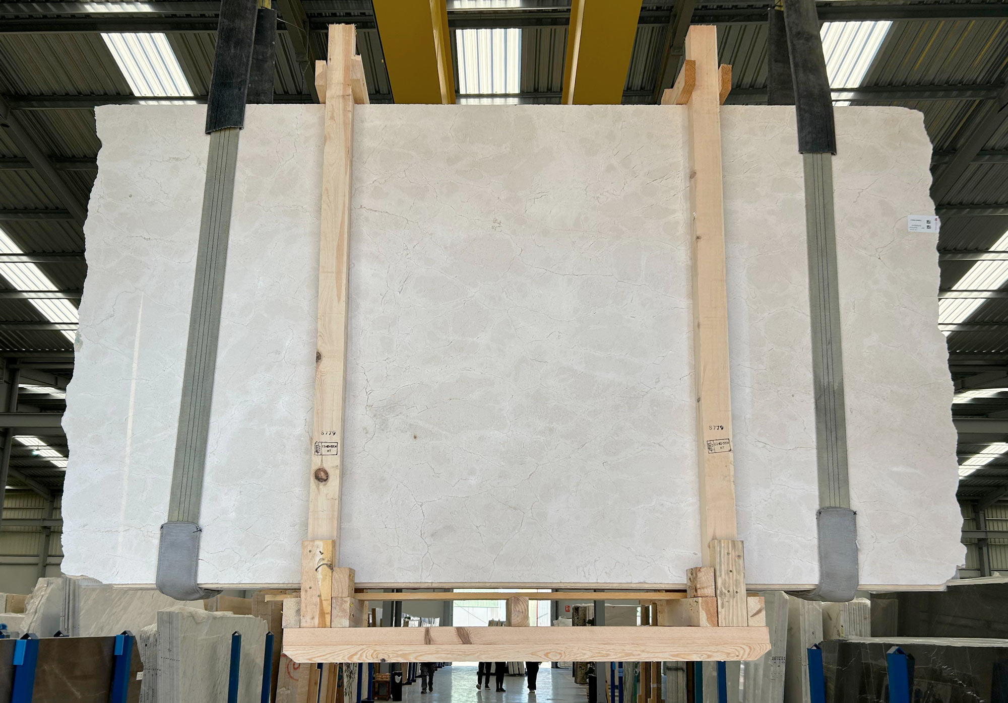 Mármol Crema Marfil en tablas pulidas de 3 cm de grosor.