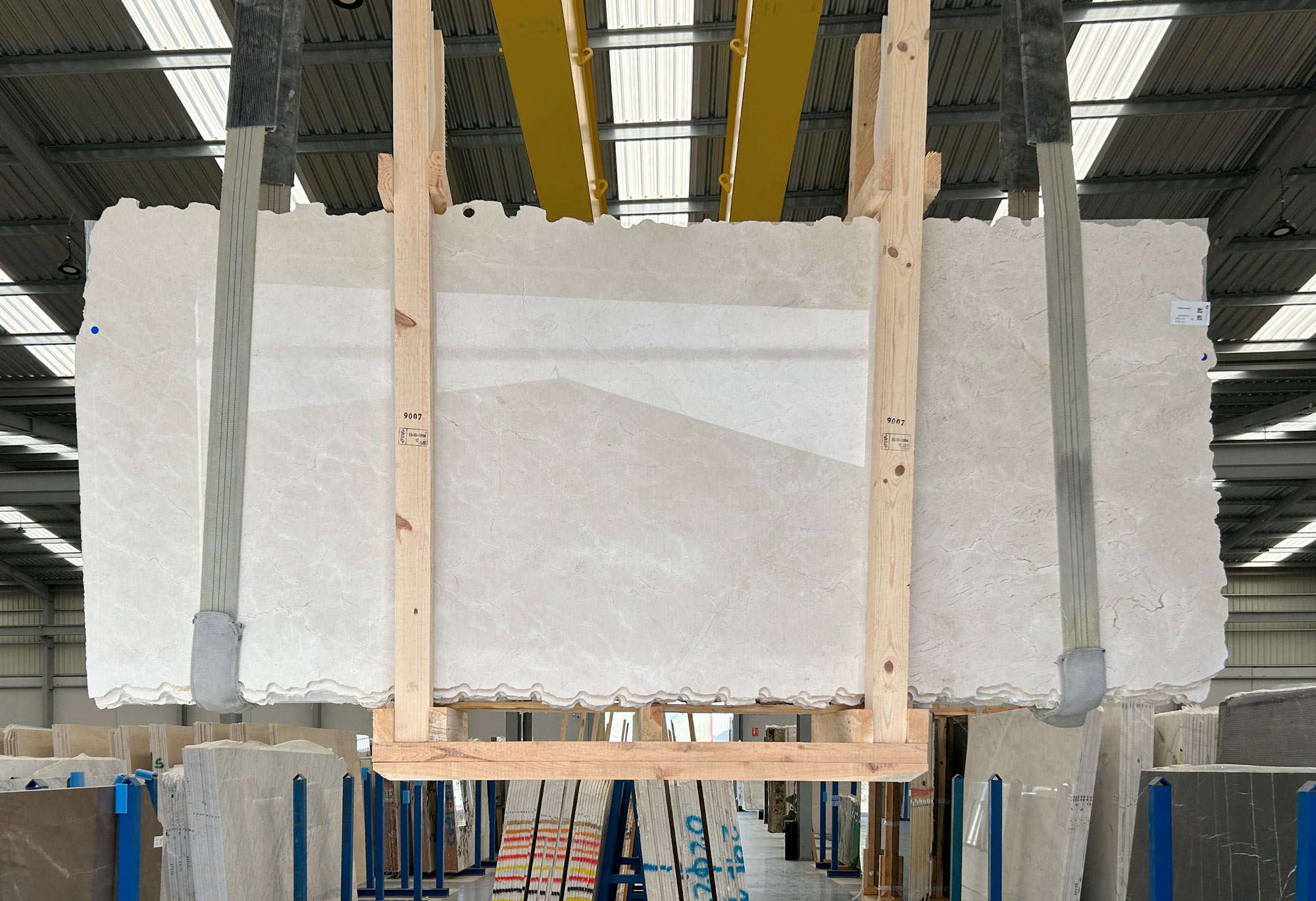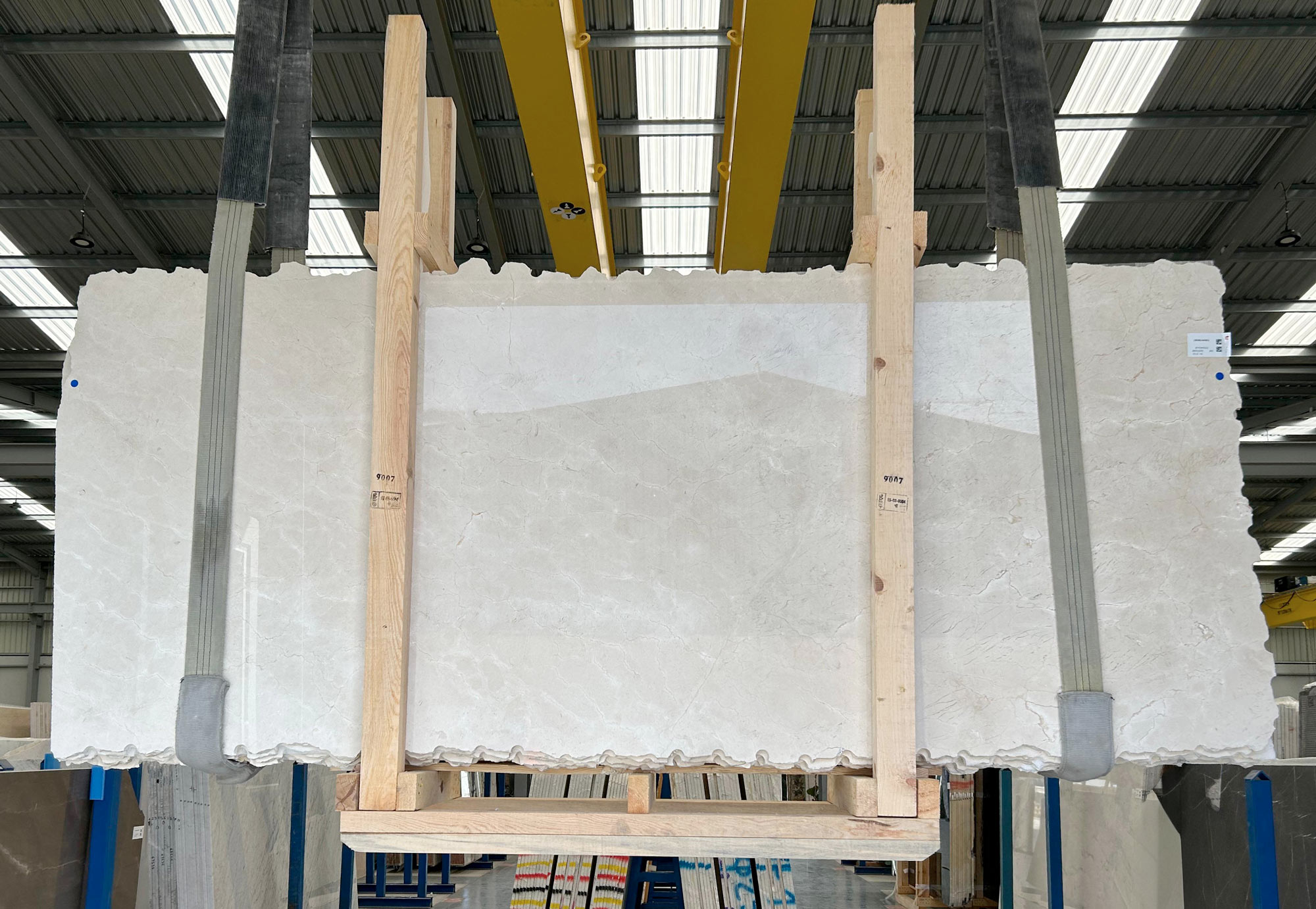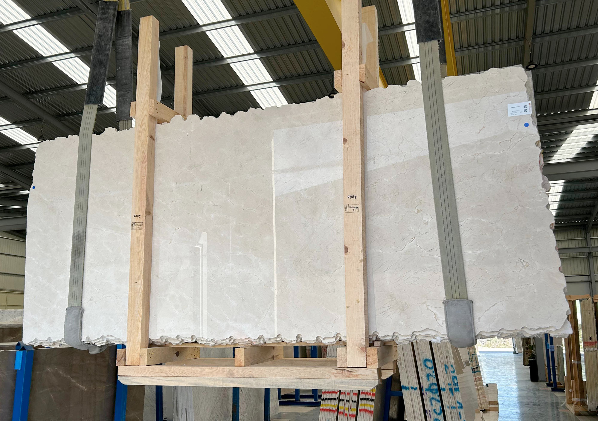 Mármol Crema Marfil en tablas pulidas de 2 cm de grosor.