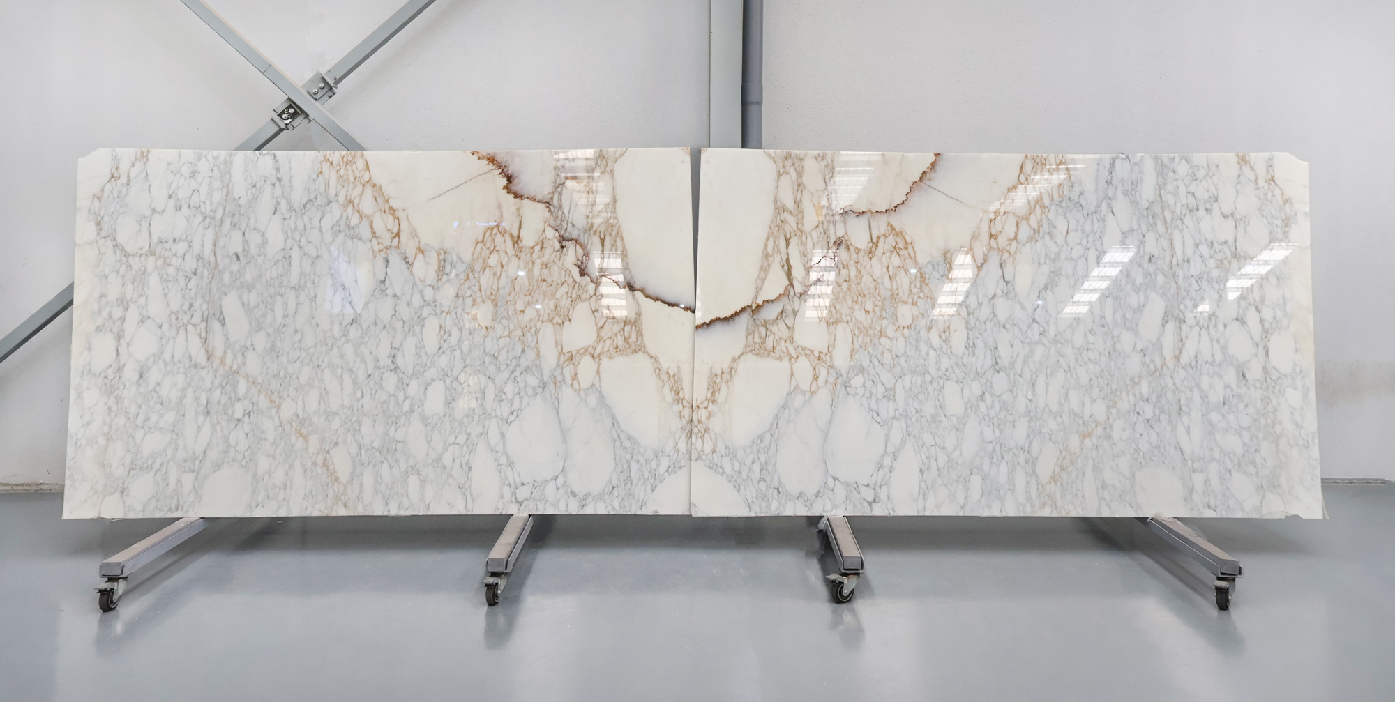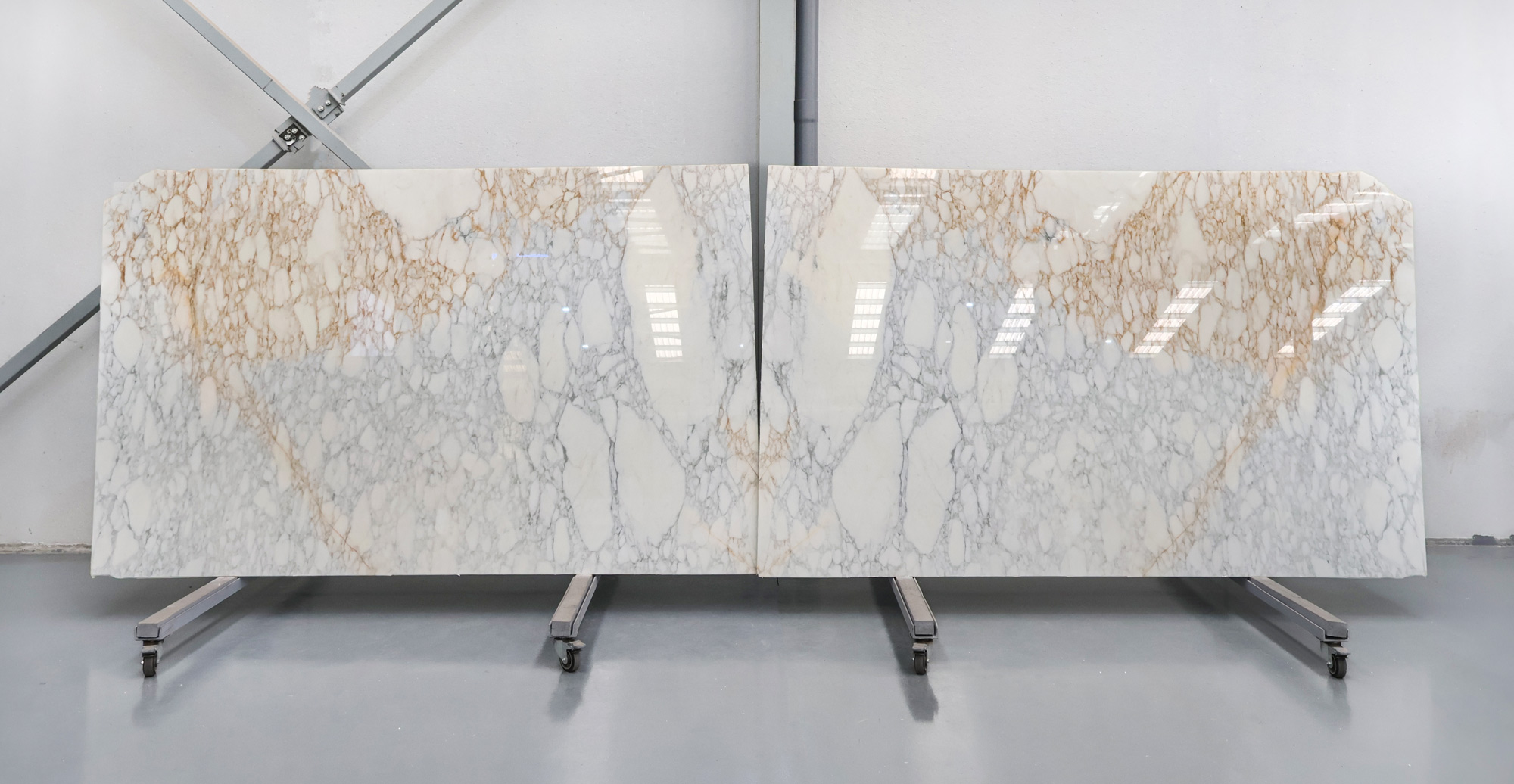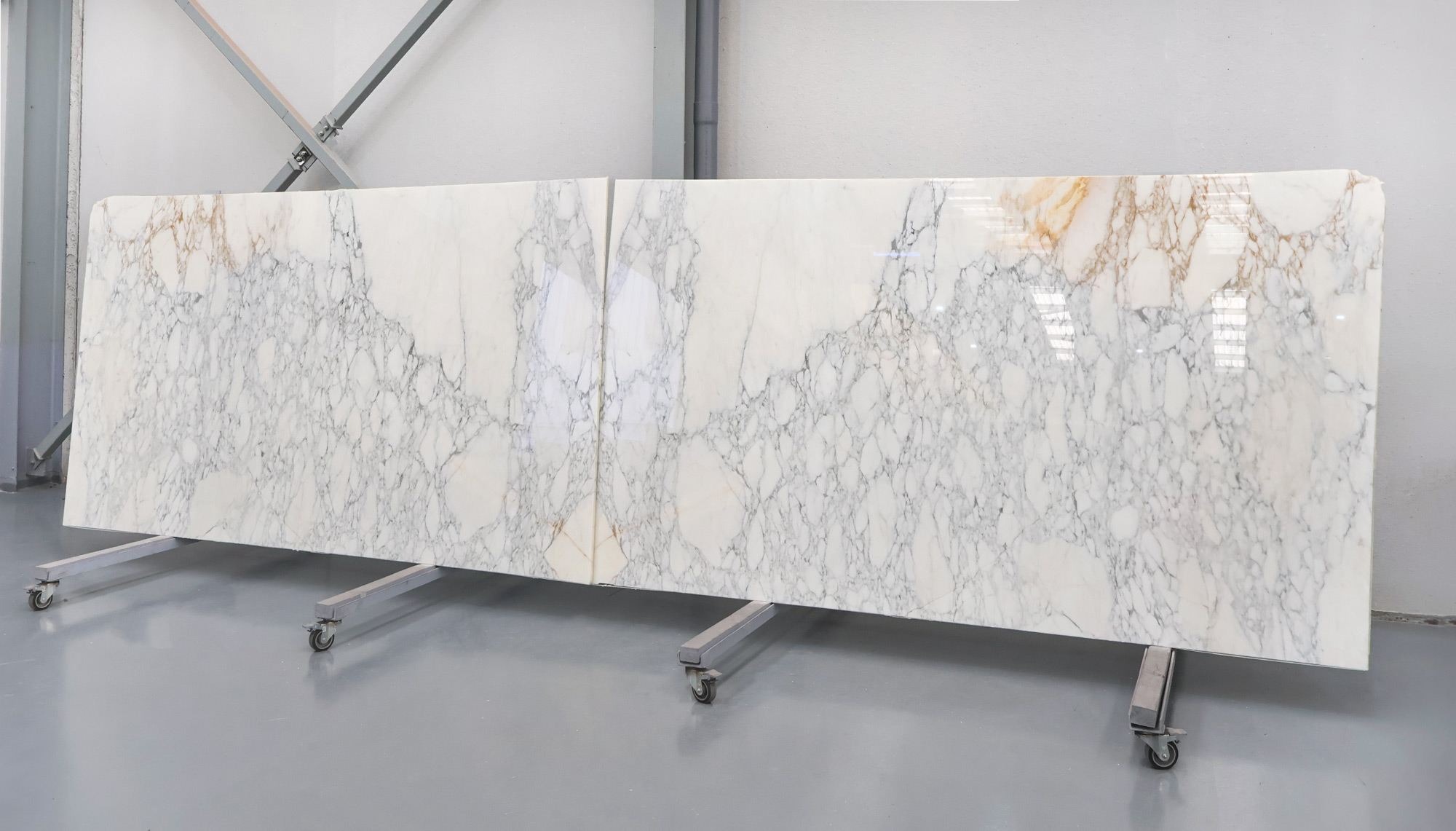 Mármol Calacatta Vagli Oro en tablas pulidas de 2 cm de grosor.