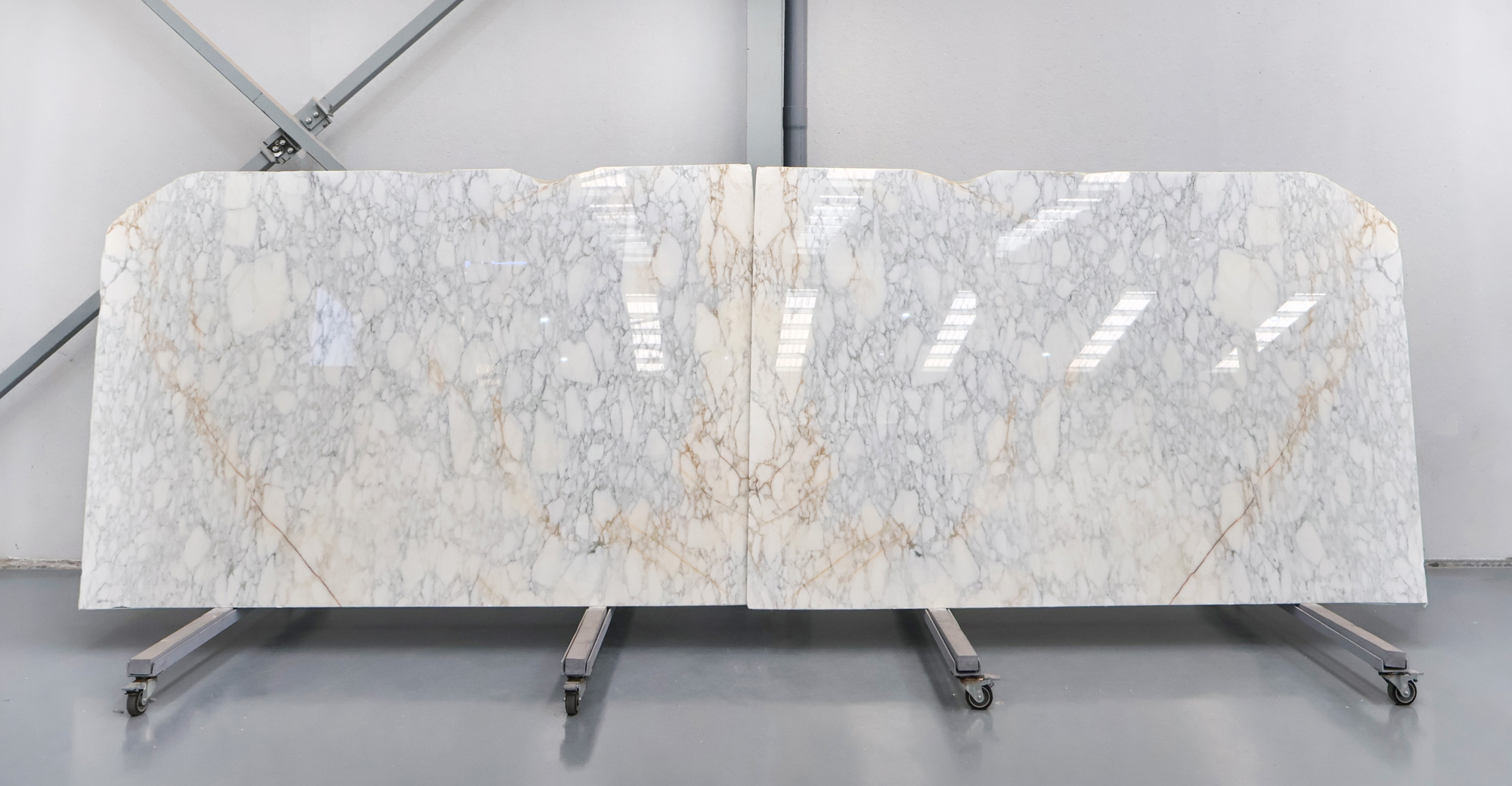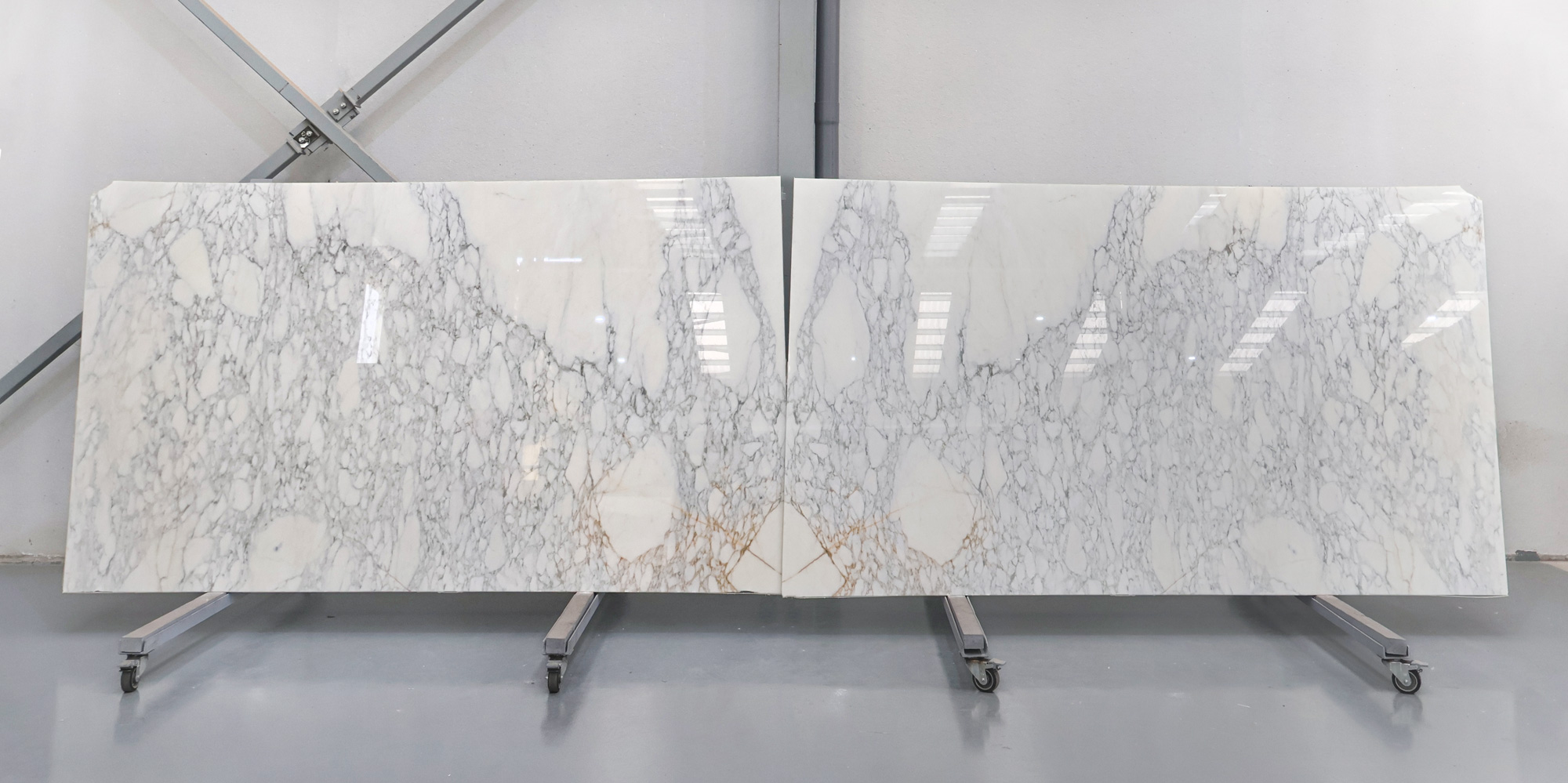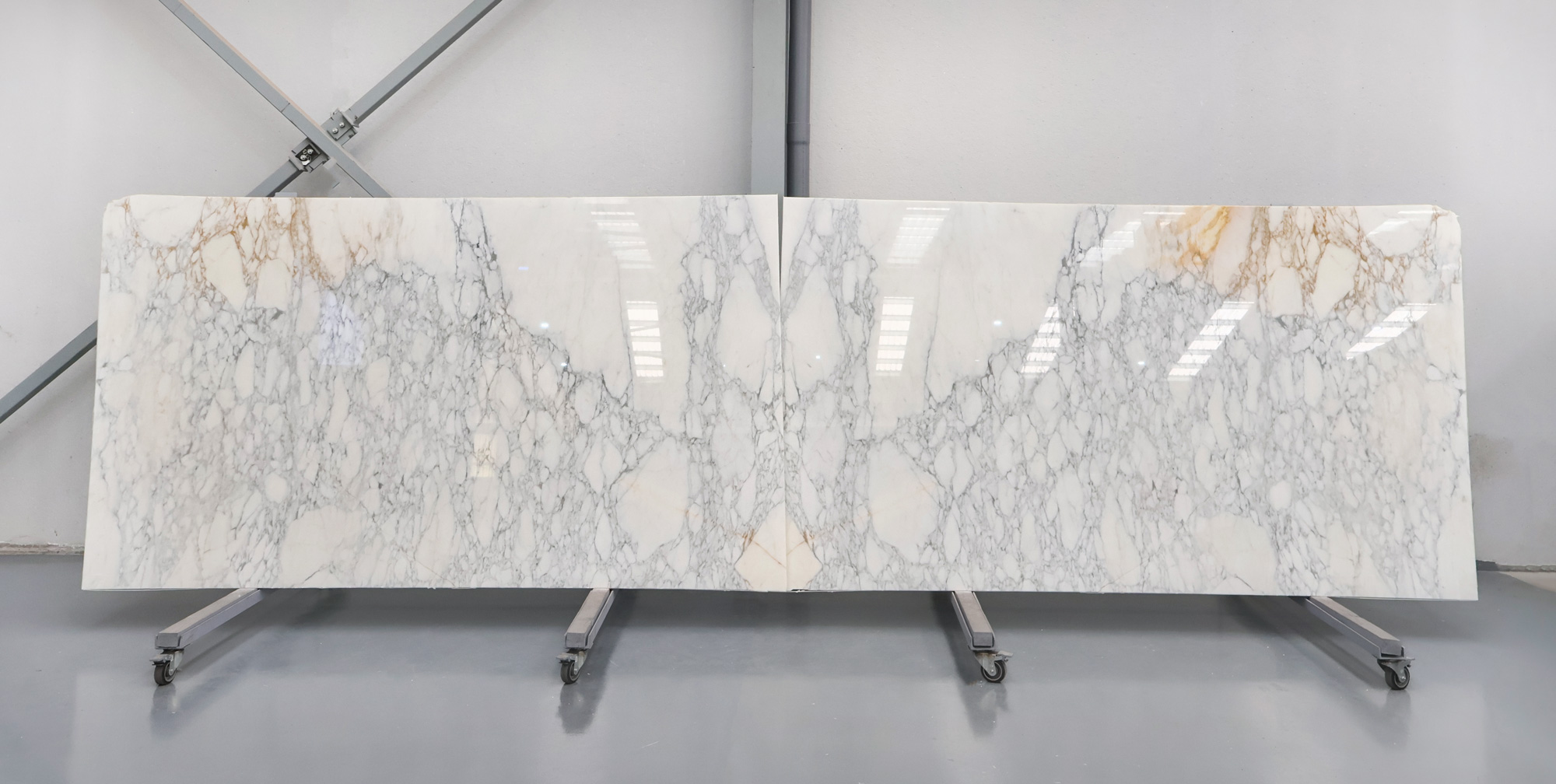 Mármol Calacatta Vagli Oro en tablas pulidas de 2 cm de grosor.