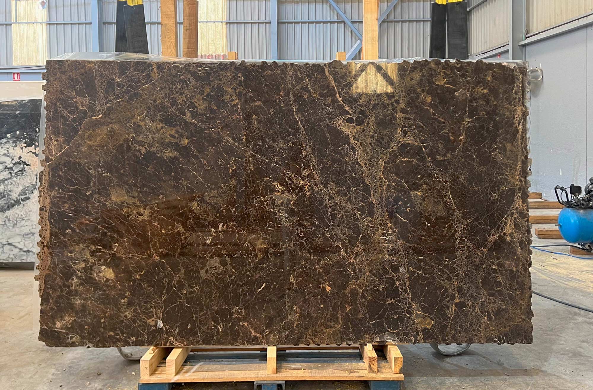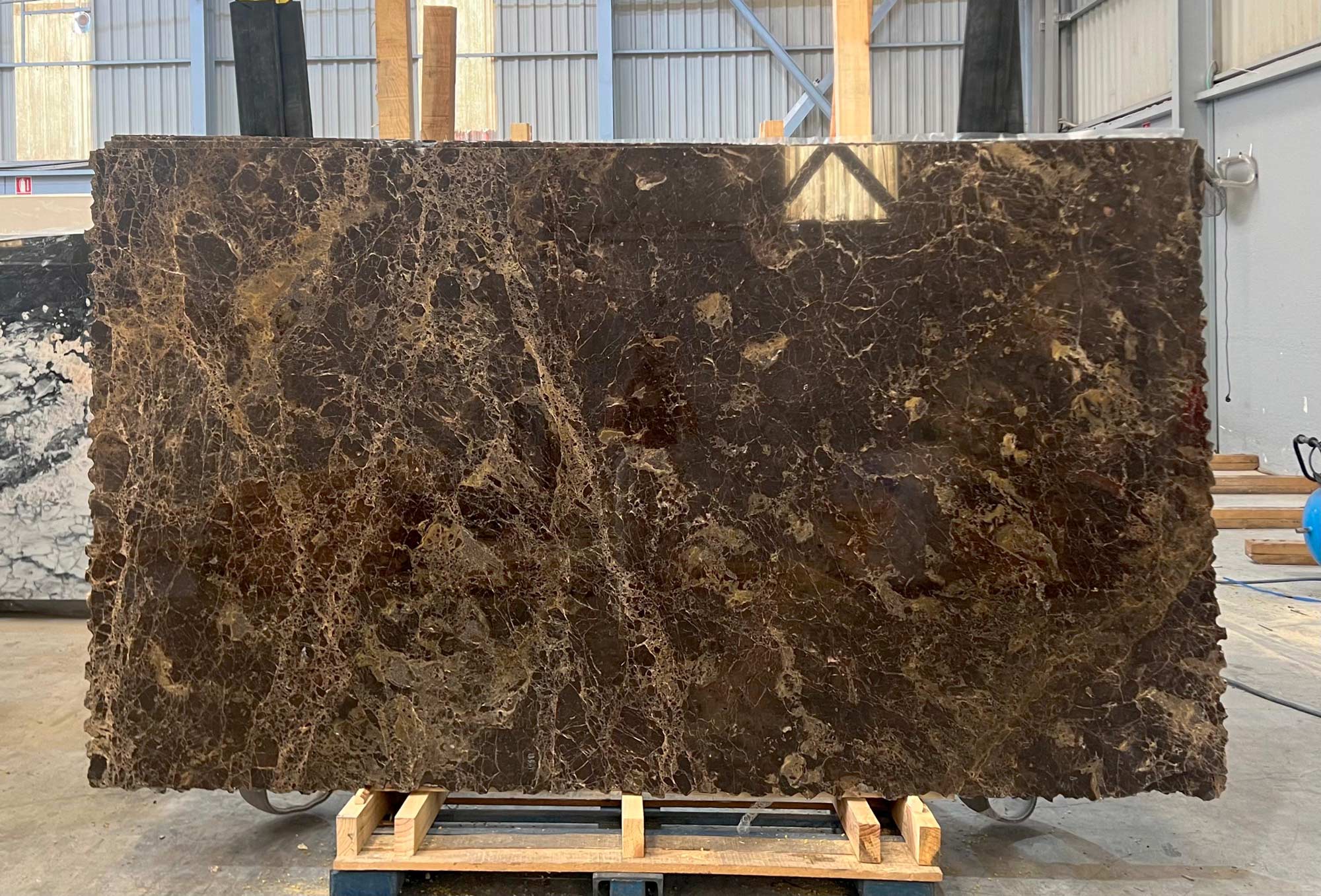 Mármol Dark Emperador en tablas pulidas de 2 cm de grosor.
