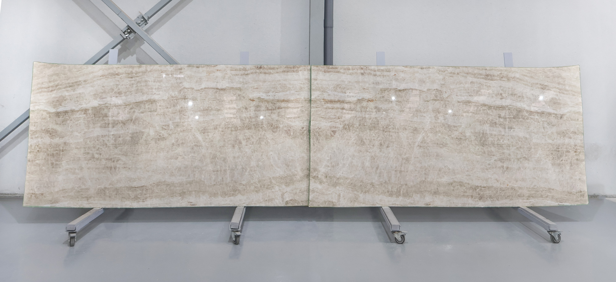 Cuarcita Taj Mahal en tablas pulidas de 2 cm de grosor.