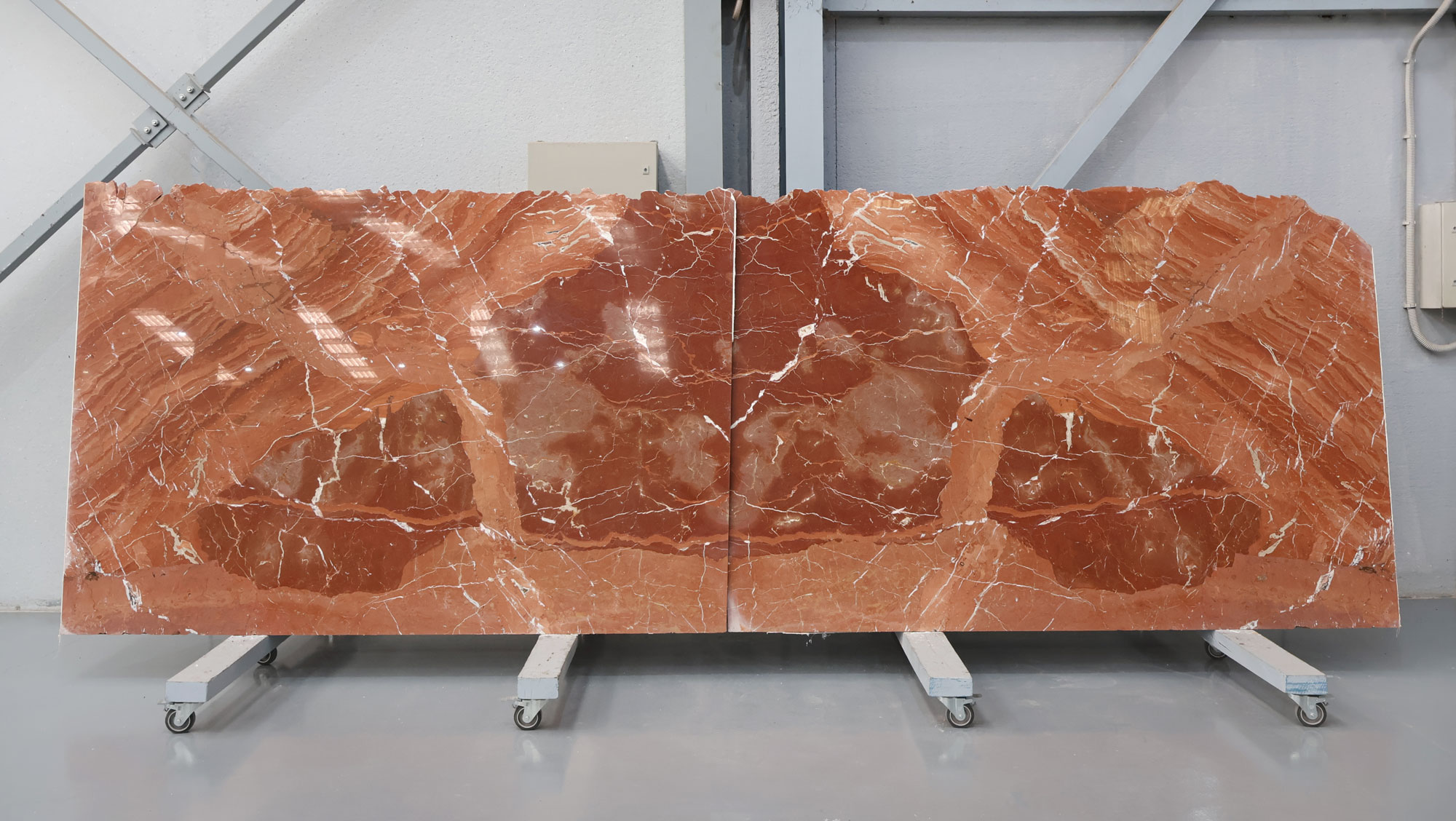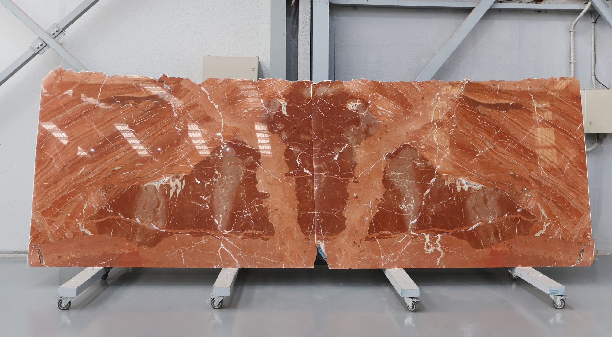 Mármol Rojo Alicante en tablas pulidas de 2 cm de grosor.