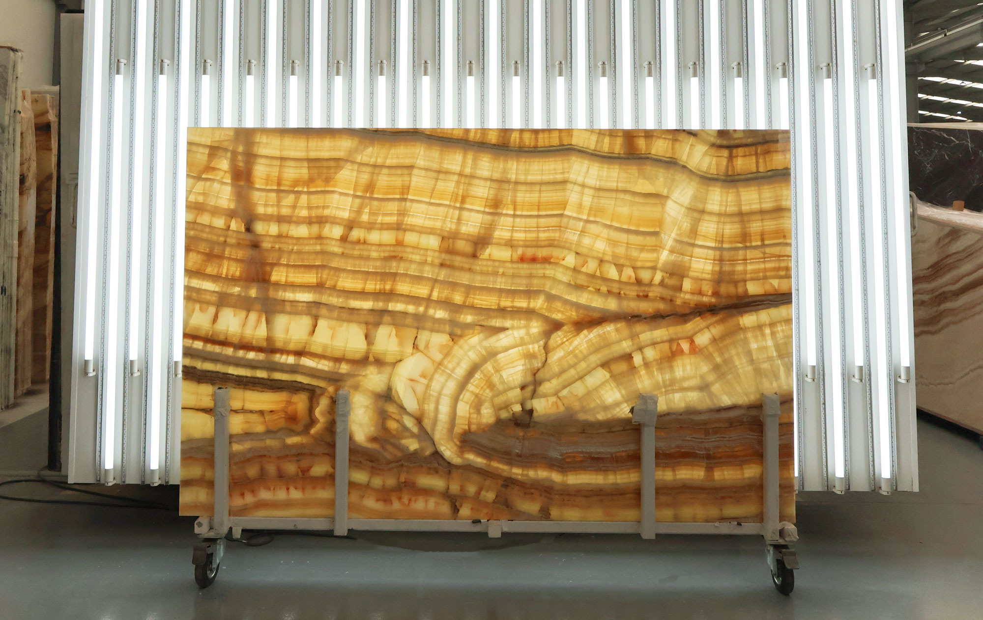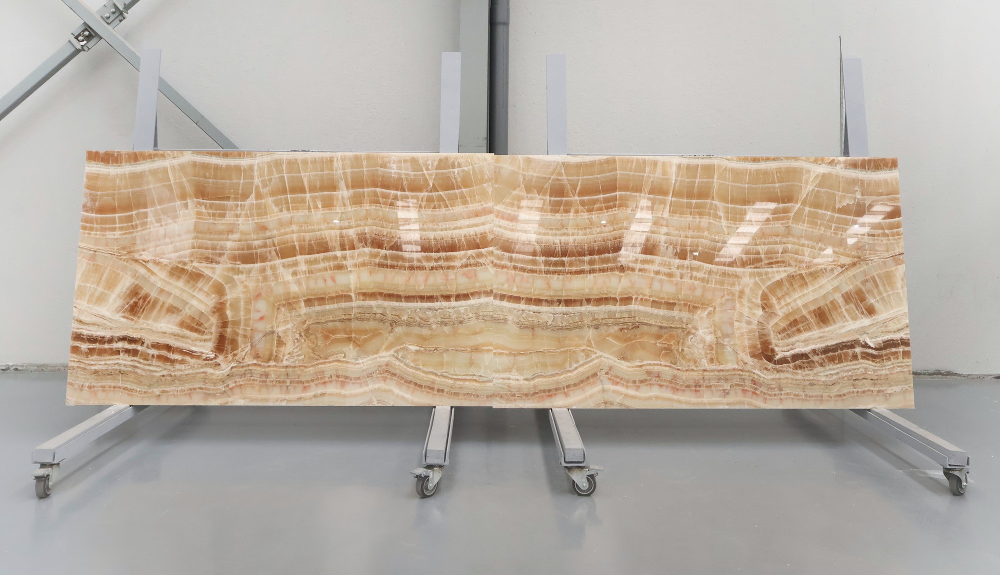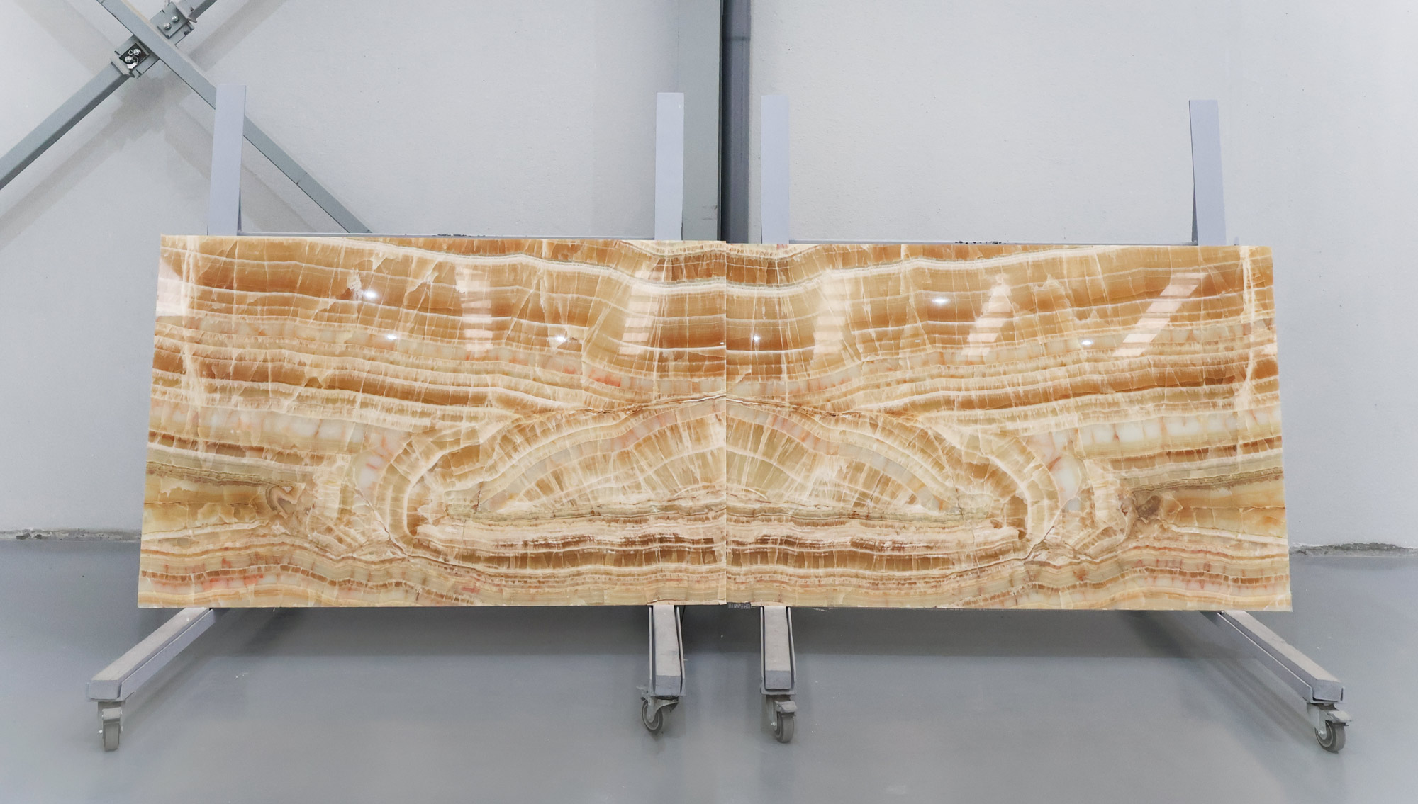 Sunset Onyx en tablas pulidas de 2 cm de grosor.
