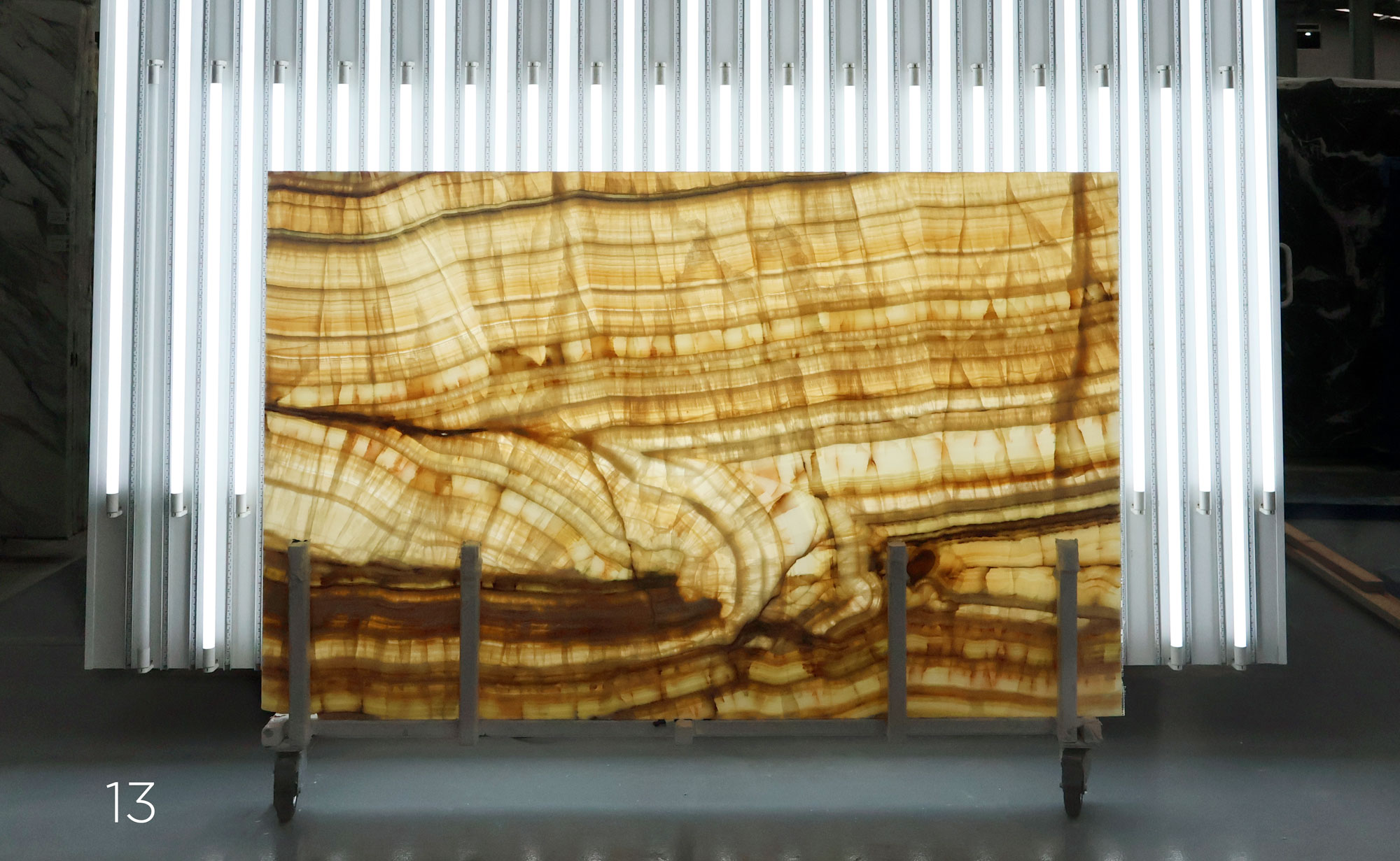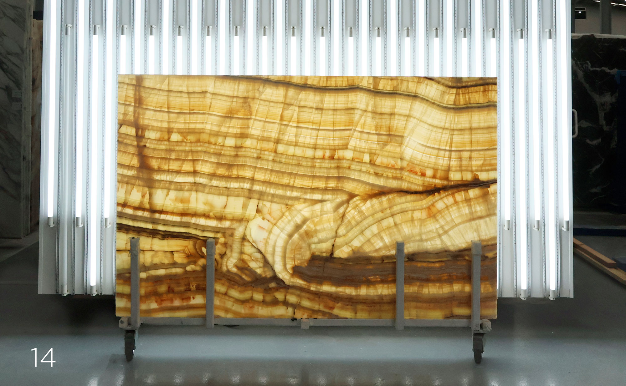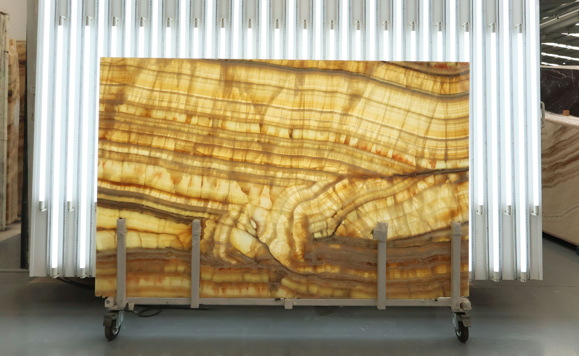 Sunset Onyx en tablas pulidas de 2 cm de grosor.