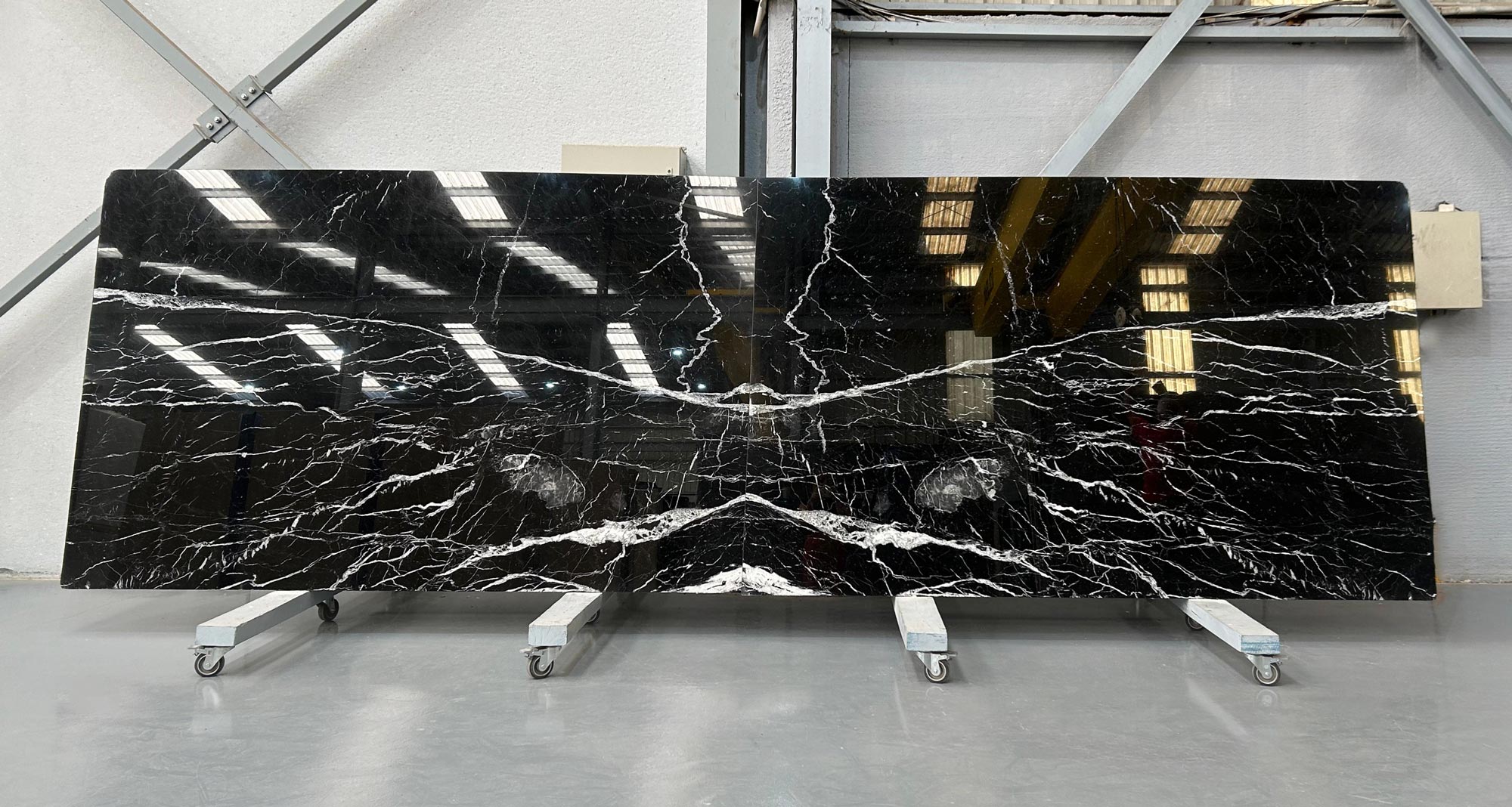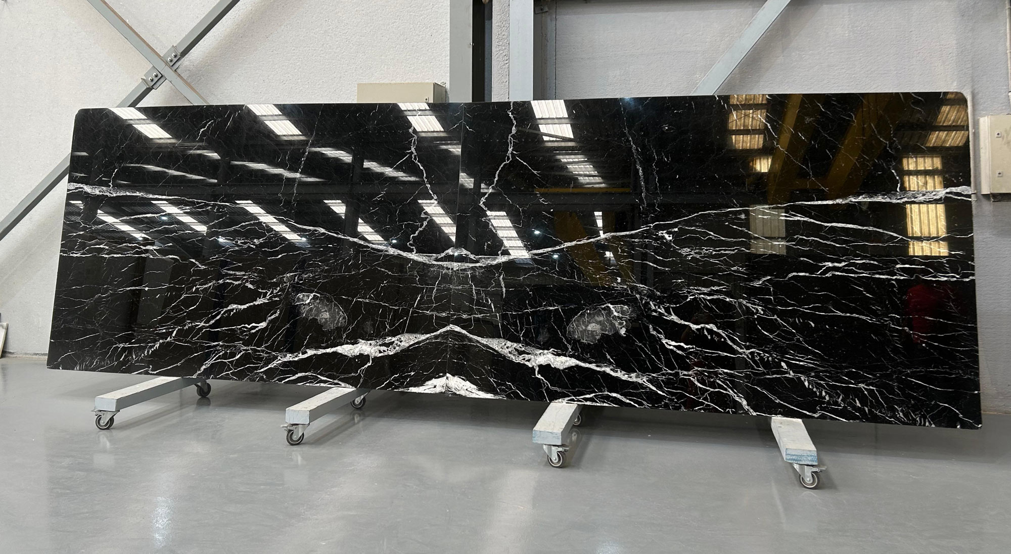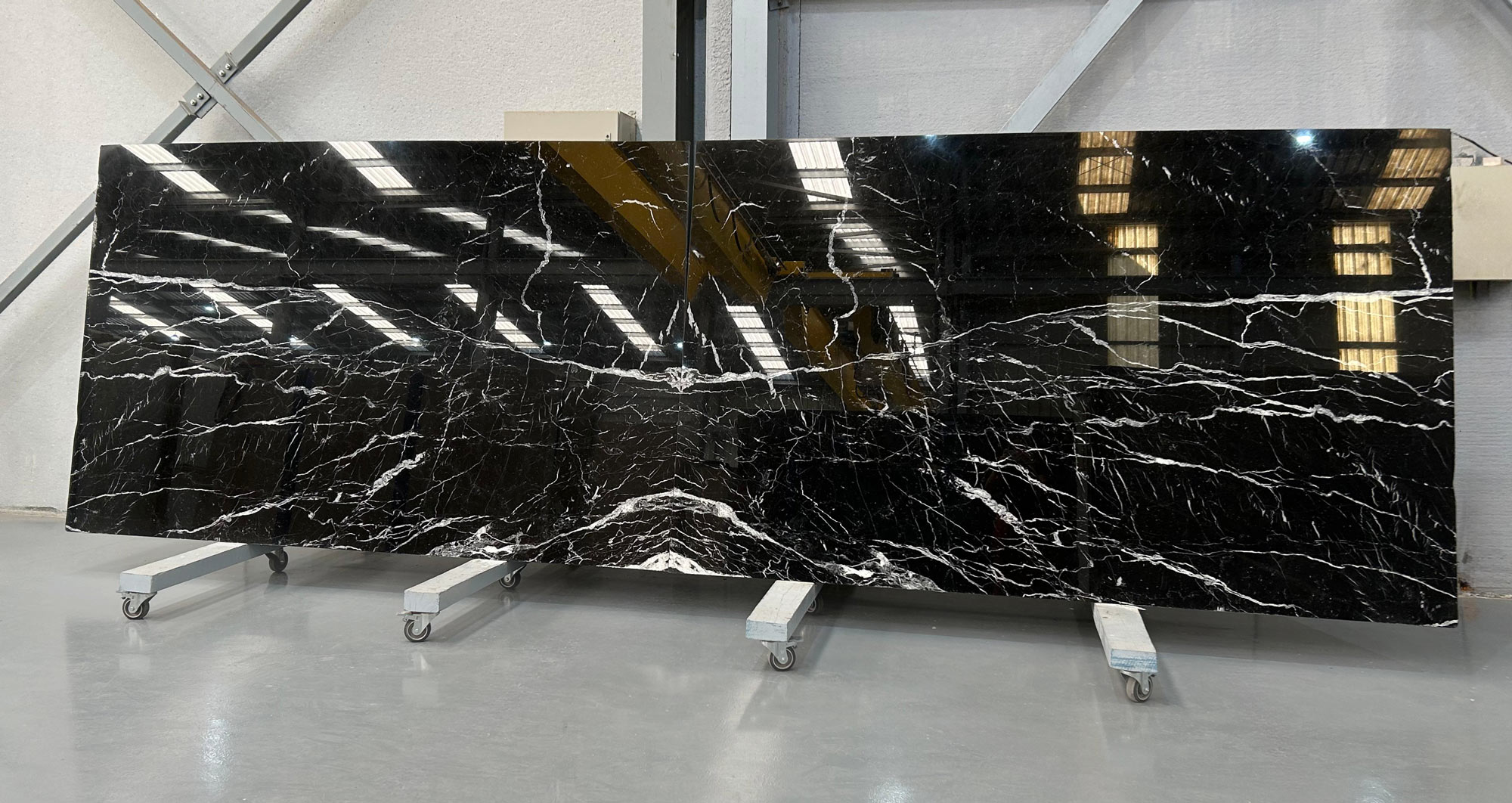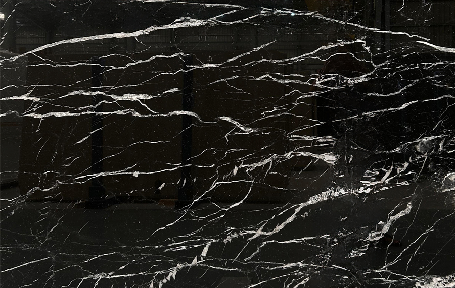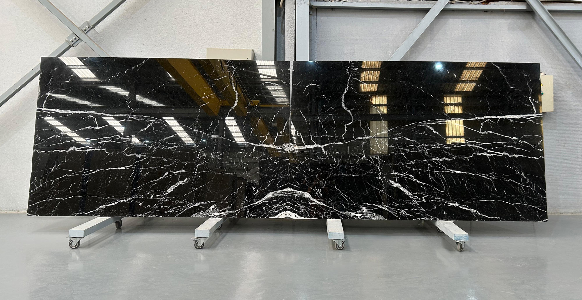 Nero Marquina marble in 2 cm thick polished slabs.