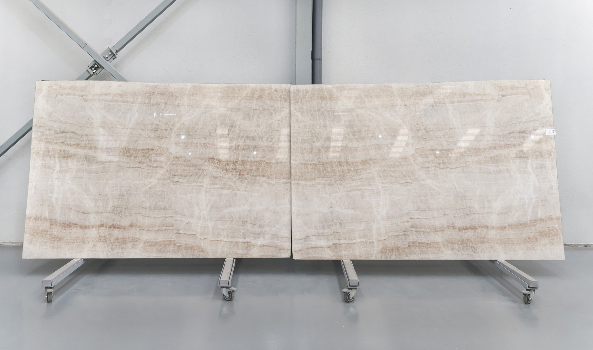 Quartzite Taj Mahal in 2 cm thick polished slabs.