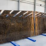 Incredible Tunisian marble with a black background characterized by warm orange, white and deep golden veining. The stone is loved by interior designers.