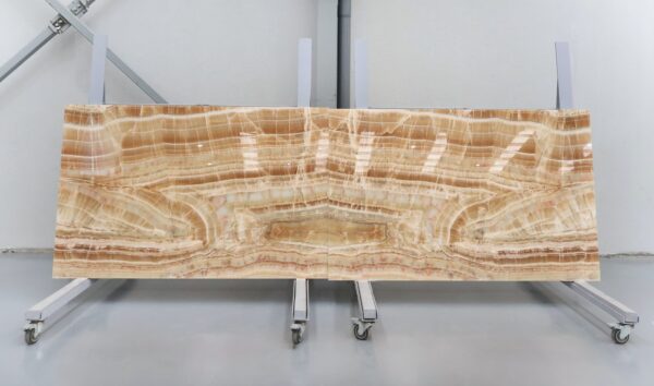 One of the defining characteristics of Sunset Onyx is its translucent structure. When backlit, the stone reveals an internal glow that enhances its layered patterns. Light passes through the crystalline veins, intensifying the warmth of the color spectrum and highlighting the natural variations.